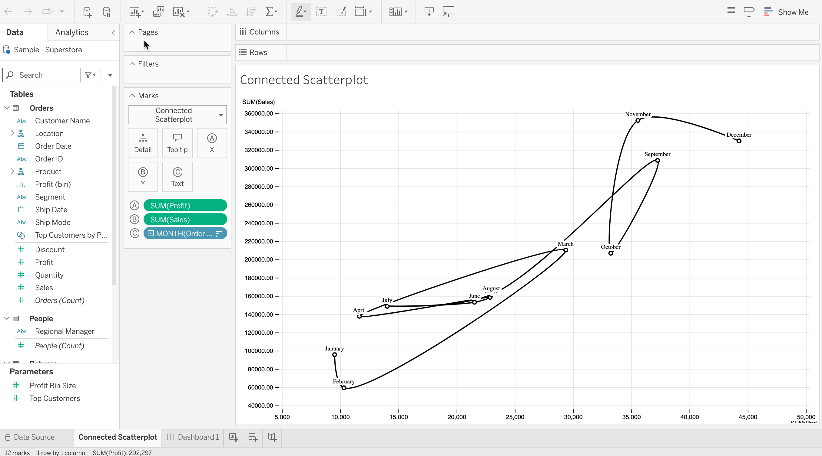 The connected scatterplot appears in the view.