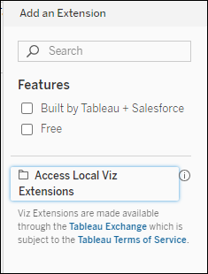 If you are looking for information about how to use viz extensions in Tableau, see Add Viz Extensions to Your Worksheet. If you are looking for extensions that you can use, see the Tableau Exchange.