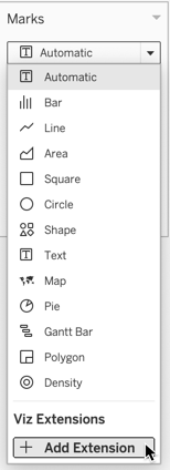 The Tableau Viz Extensions API allows developers to create new viz types that Tableau users can access through the worksheet Marks card. Like Dashboard Extensions, Viz Extensions are web applications that can interact and communicate with Tableau. Developers will be able to build bespoke Viz Extensions that can be made available to Tableau users through the Tableau Extensions API.